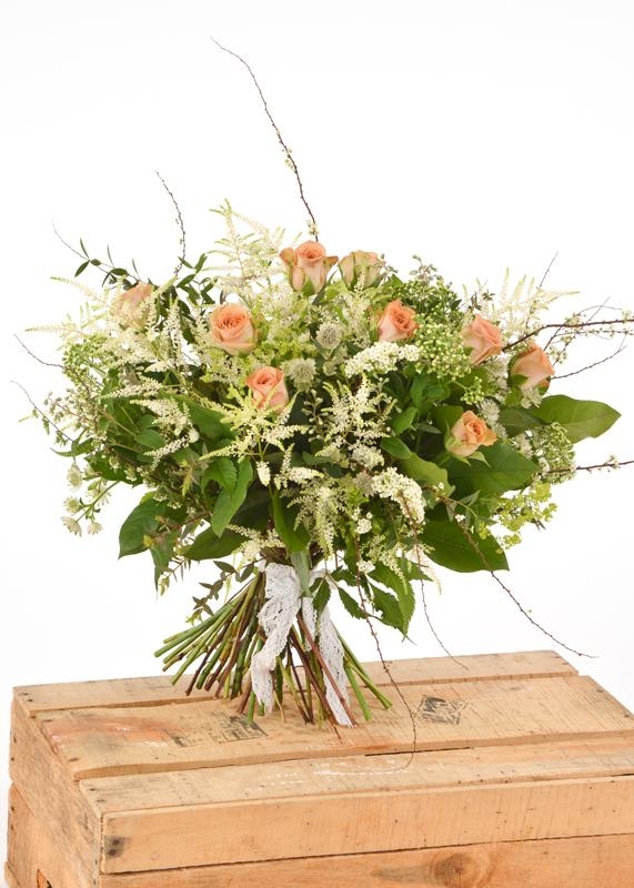 Wild, loose handtied bouquet of mixed foliage, sticks and flowers. Vintage style in abundance.